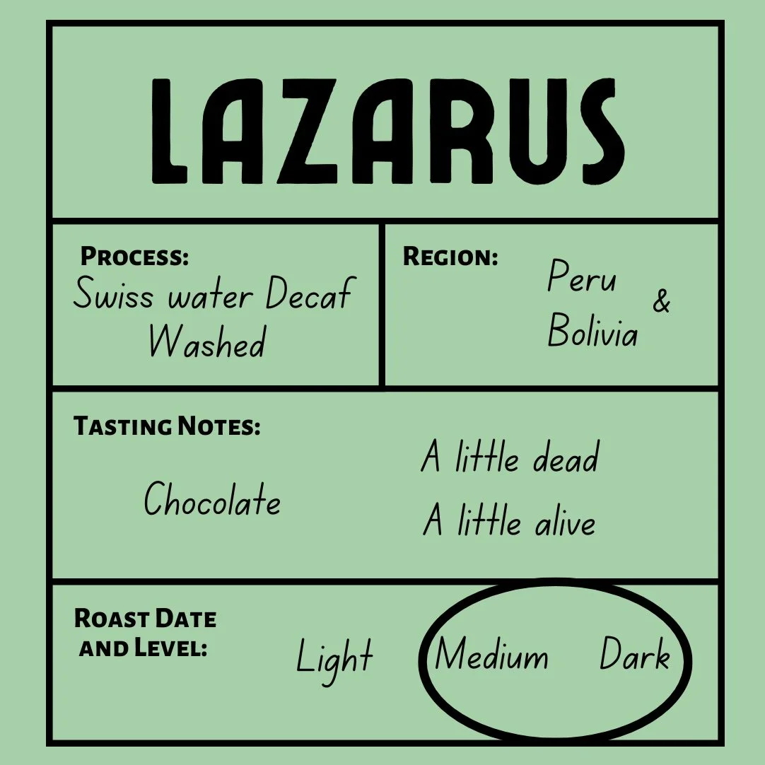 Store › Lazarus (Half Caffeine) Image 1 of 1 Lazarus (Half Caffeine) from $15.00 Half is my Swiss water Peru decaf and the other half is my Bolivia Whole Bean or Ground Options: Select Whole Bean or Ground Options Whole Bean Fine Grind (Espresso Machines) Medium Grind (Drip Machines, Pour Over, Aeropress) Coarse Grind (Cold Brew, French Press) Size: Select Size Half Pound 1 Pound Add To Cart Added! Half is my Swiss water Peru decaf and the other half is my Bolivia Reviews Reviewer Name Review Date Star Rating Description Posted on Etsy Product Show More